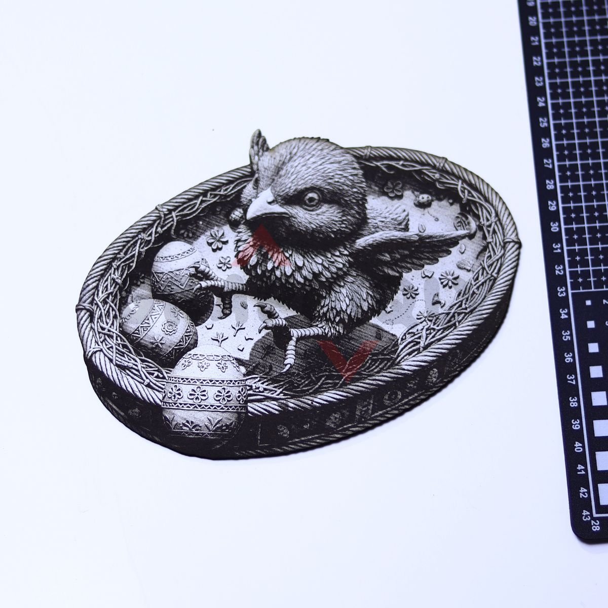 Chick in Nest with Eggs 3D Illusion features a baby chick nestled among eggs with braided nest texture and clean contrast designed for crisp engraving.