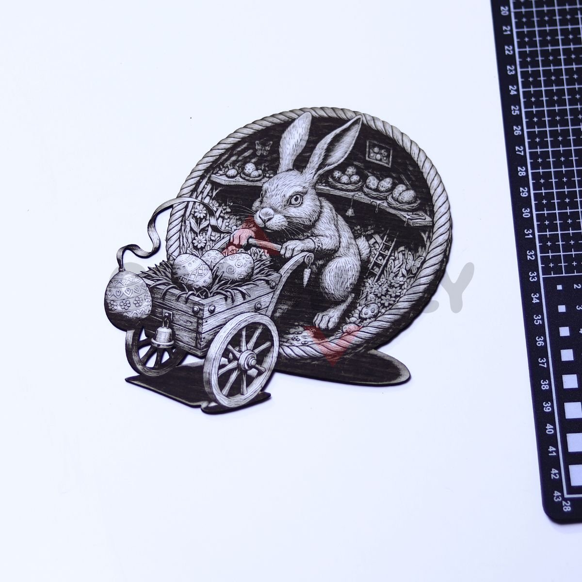 Egg Cart Captain 3D Illusion shows a bunny at the wheel of a little cart loaded with eggs, framed in a round scene with crisp texture for clean engraving.