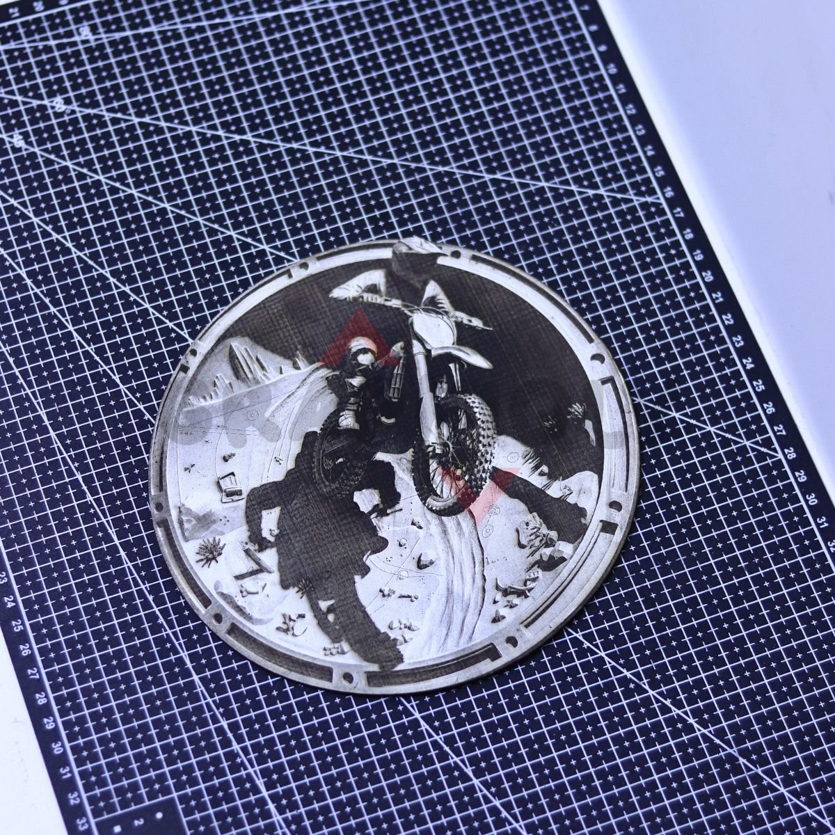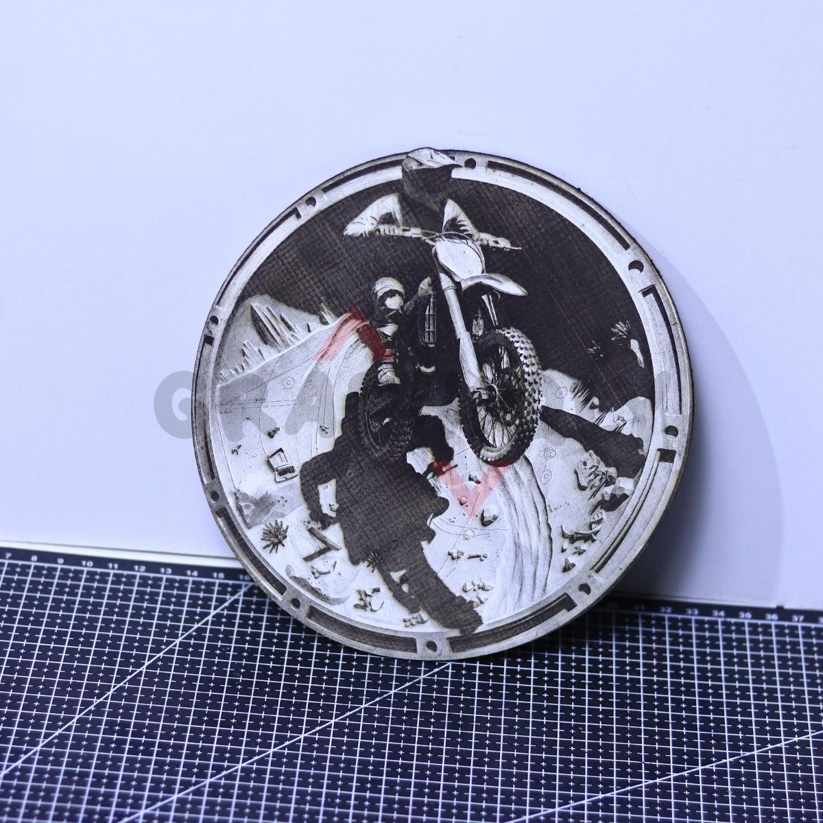 Motocross Desert Jump 3D Illusion features a rider launching through desert terrain with strong motion textures for a dramatic, engraved finish.