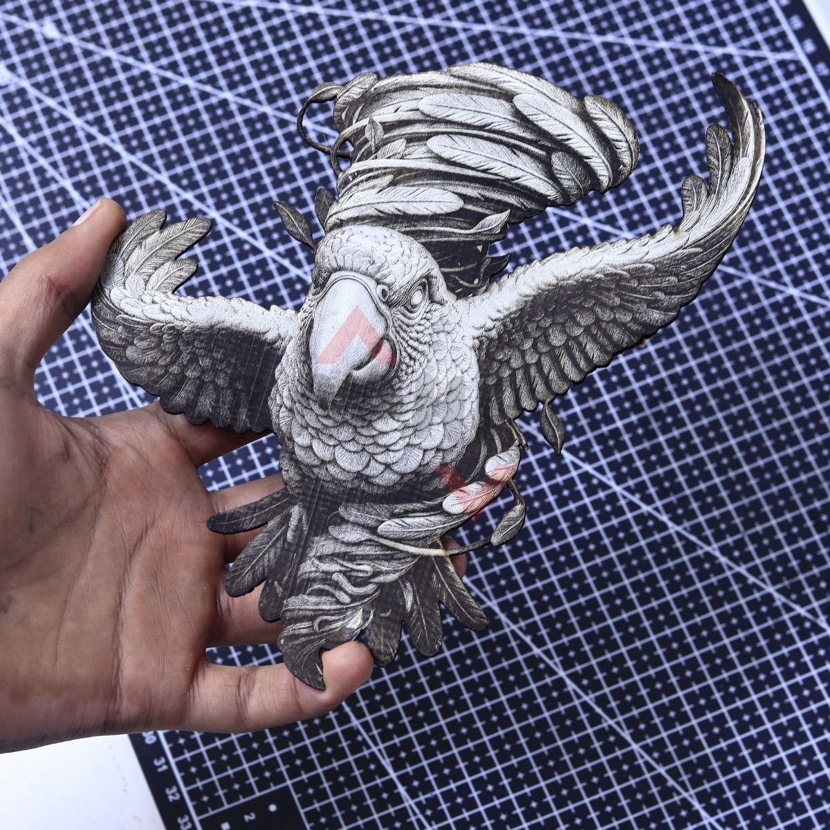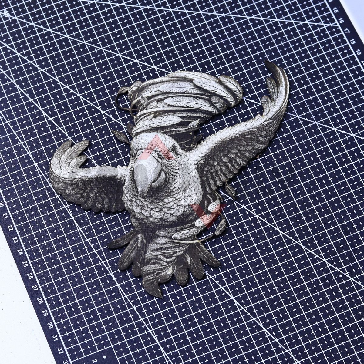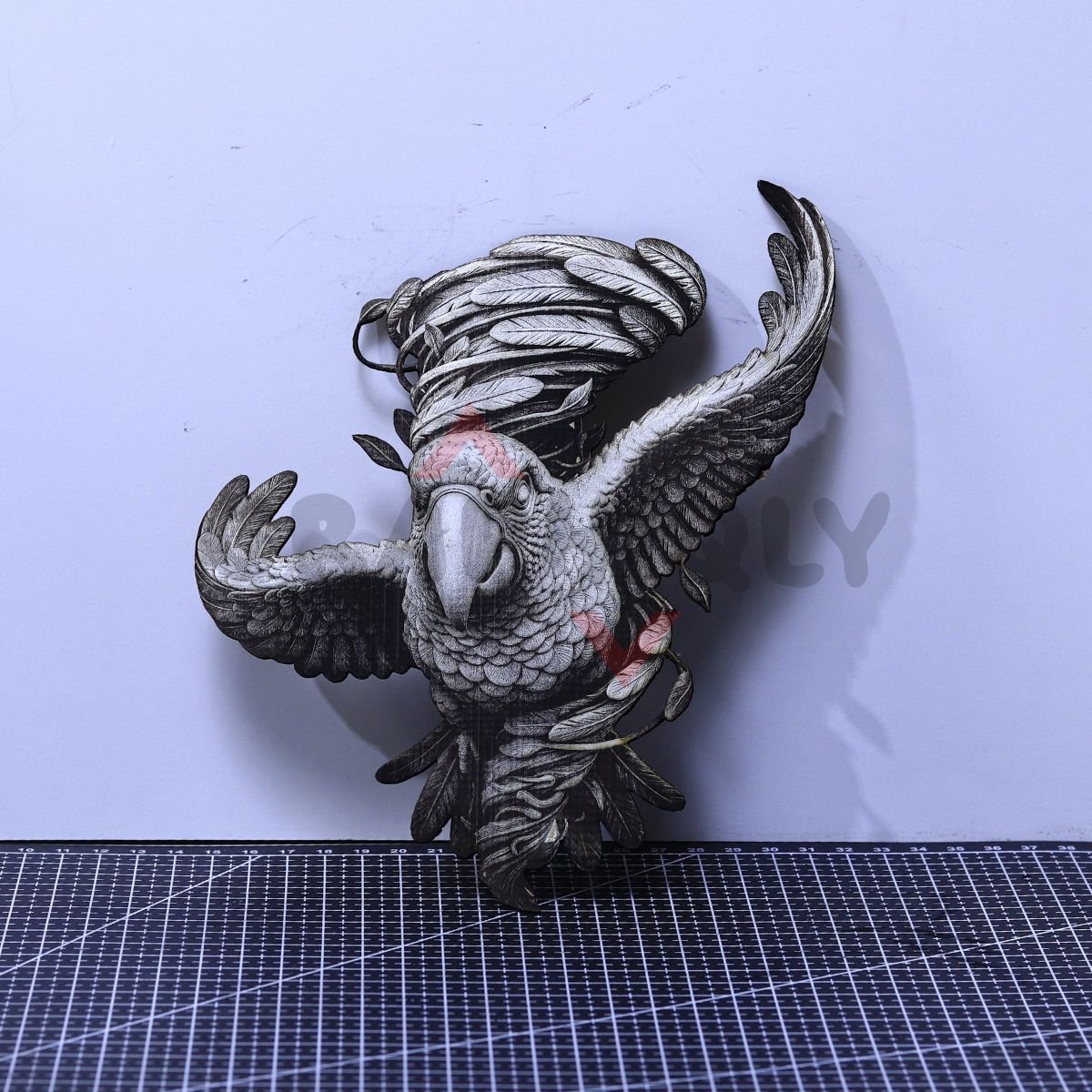 Striking parrot 3D illusion with wings spread and a dramatic feather spiral tail — perfect for tropical decor and bird lovers. Includes SVG, LBRN2 (LightBurn), XCS (xTool), WWS (WeCreat), PNG, BMP.