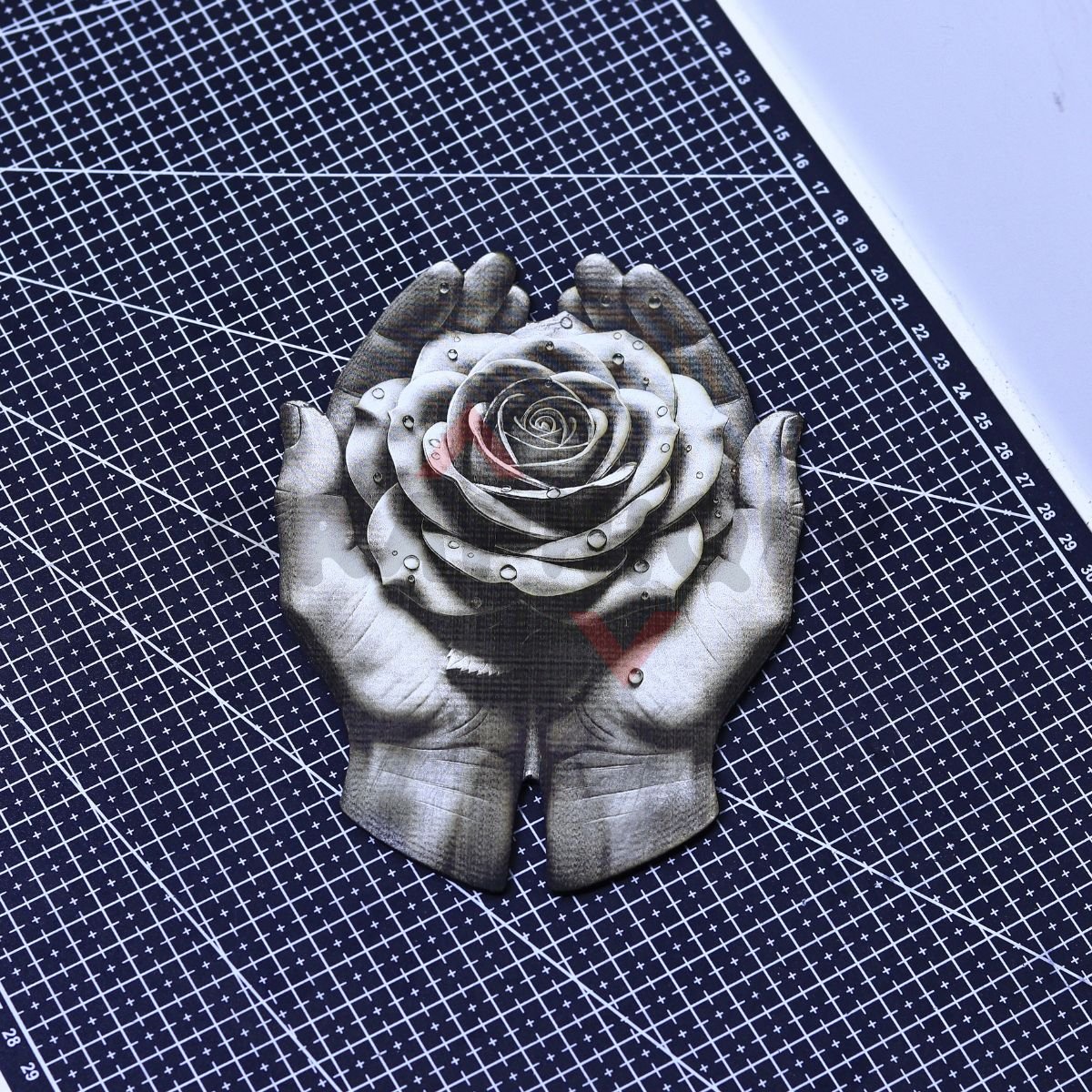 Rose Offering 3D Illusion features two hands presenting a detailed rose bloom, with strong contrast and fine petal texture designed to engrave cleanly and read beautifully as a centerpiece.