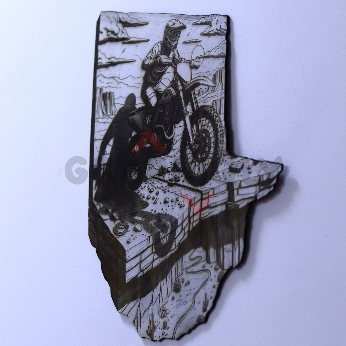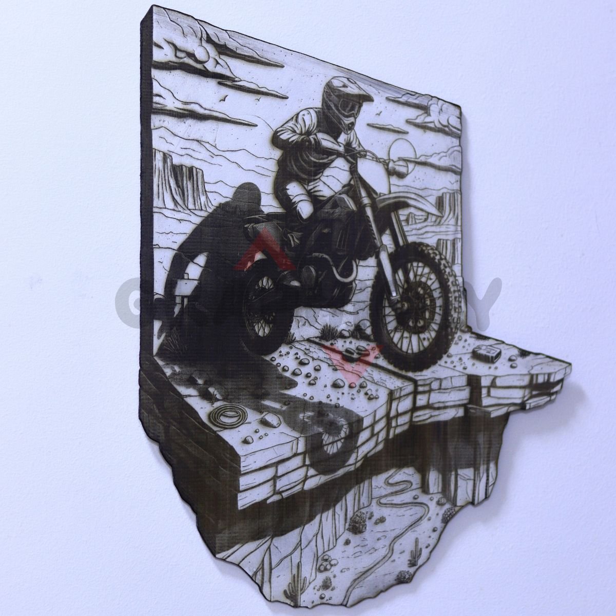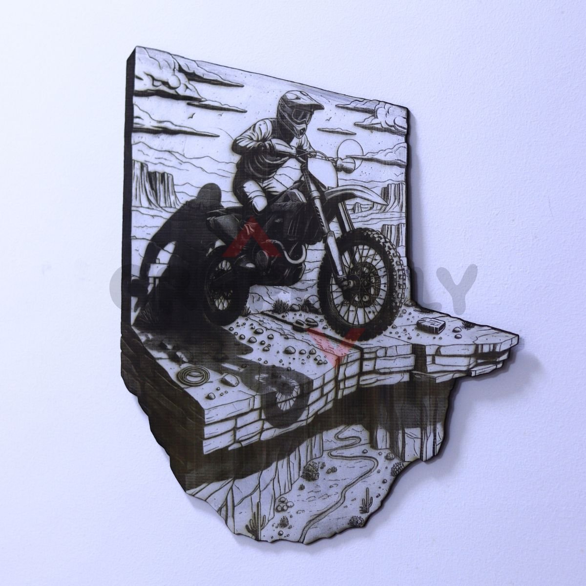 Cinematic sunset cliff send 3D illusion with a rider jumping against a dramatic landscape — perfect for motocross fans and adventure decor. Includes SVG, LBRN2 (LightBurn), XCS (xTool), WWS (WeCreat), PNG, BMP.