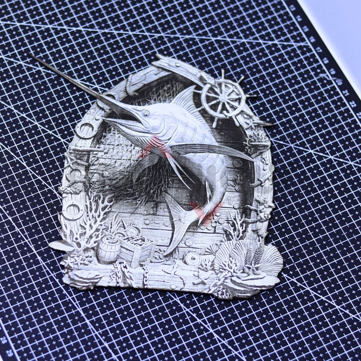 Swordfish Ocean Scene 3D Illusion combines a dynamic swordfish with underwater textures, reef details, and nautical framing elements for a packed ocean-themed engraving.
