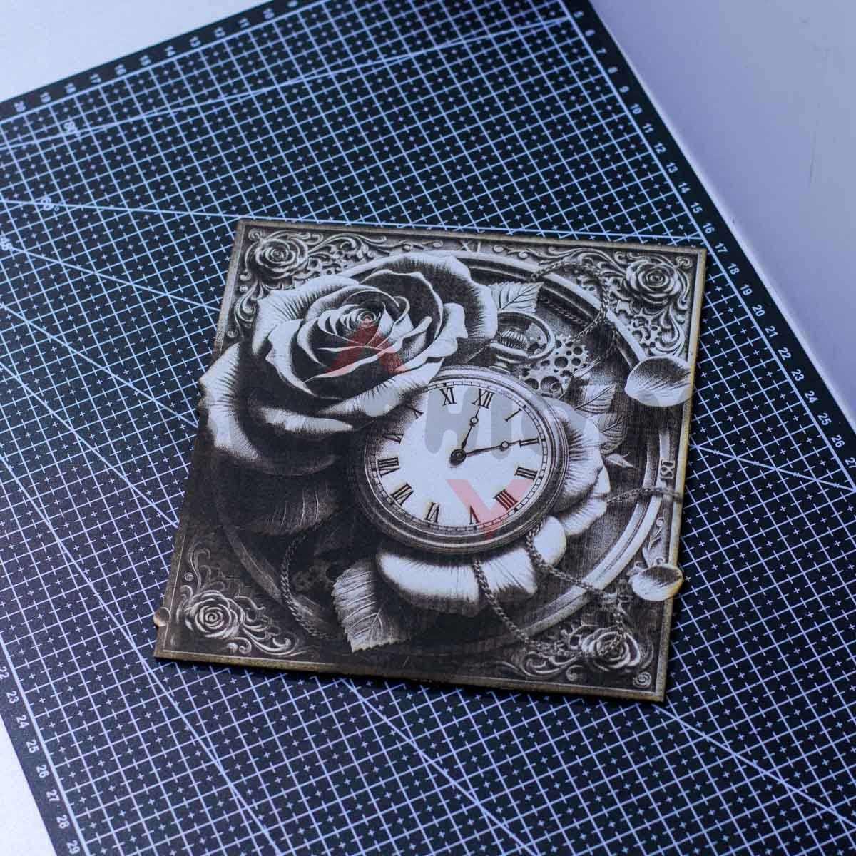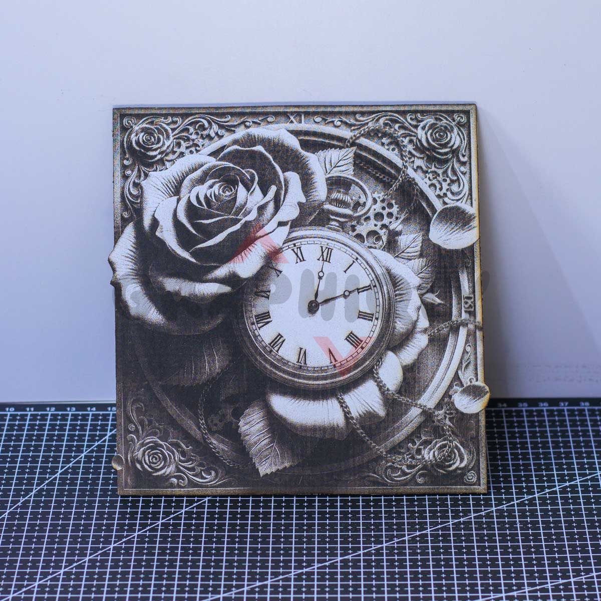 Timeless Rose Clock 3D Illusion combines a detailed rose with a classic clock face in a clean square layout, designed for crisp engraving and a classy finished look.